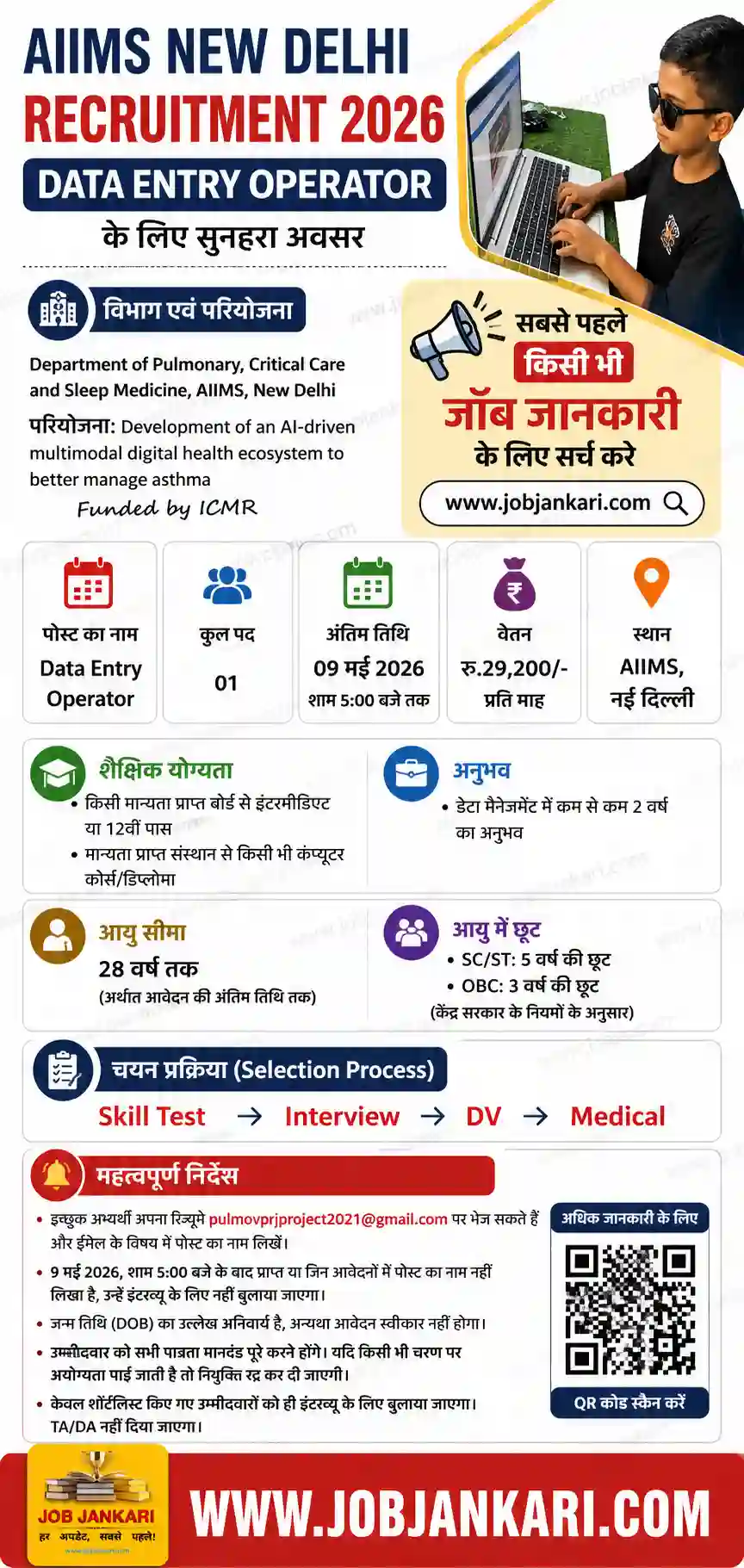 - AIIMS Delhi Data Entry Operator (DEO) Recruitment 2026उन युवाओं के लिए स्वर्णिम अवसर है जो शैक्षणिक रूप से 12वीं पास हैं, कंप्यूटर जानते हैं और जिनके पास डेटा मैनेजमेंट का 2 साल का अनुभव है। यह आपको न केवल प्रतिष्ठित AIIMS जैसे संस्थान में काम करने का मौका देगा बल्कि आपको ICMR प्रोजेक्ट का हिस्सा बनने का गौरव भी प्रदान करेगा।