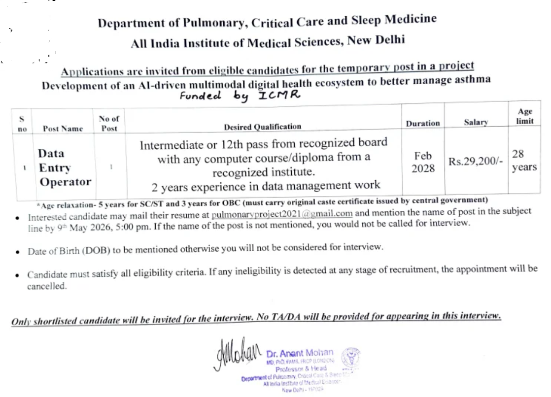 AIIMS Delhi Recruitment 2026: केंद्र सरकार की नौकरी पाने वालों के लिए, अखिल भारतीय आयुर्विज्ञान संस्थान (AIIMS), नई दिल्ली ने डेटा एंट्री ऑपरेटर (DEO) के पद पर एक नया मौका दिया है। यह भर्ती ICMR (भारतीय चिकित्सा अनुसंधान परिषद) फंडेड प्रोजेक्ट “Development of an AI-driven multimodal digital health ecosystem to better manage asthma” (अस्थमा के बेहतर प्रबंधन के लिए AI-आधारित डिजिटल स्वास्थ्य पारिस्थितिकी तंत्र का विकास) के अंतर्गत है।