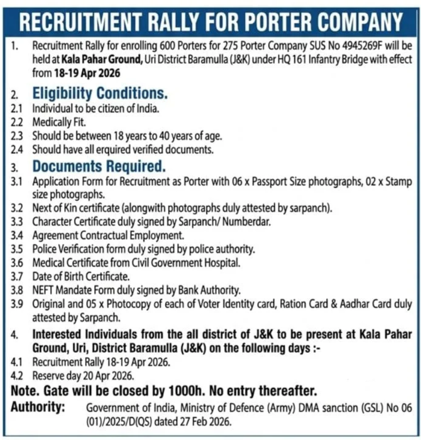 Army Porter Bharti 2026 Jammu & Kashmir: 136 (I) इन्फैंट्री ब्रिगेड ग्रुप पोर्टर कंपनी ने 600 पोर्टर पदों के लिए इंडियन आर्मी पोर्टर भर्ती 2026 की घोषणा की है। यह भर्ती हिमाचल हिल पोर्टर कंपनी के माध्यम से की जा रही है। यह 179 दिनों की एक संविदात्मक (कॉन्ट्रैक्ट पर आधारित) नौकरी है। केवल 18 से 40 वर्ष की आयु के पुरुष भारतीय नागरिक ही आवेदन कर सकते हैं। ऑनलाइन पंजीकरण आधिकारिक वेबसाइट 136himachalhillportercompany.org पर खुला है।