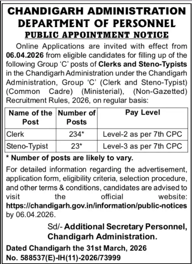 Chandigarh Administration Recruitment 2026 Apply Online: चंडीगढ़ प्रशासन क्लर्क भर्ती 2026 की अधिसूचना 31 मार्च 2026 को जारी कर दी गई है। चंडीगढ़ प्रशासन के कार्मिक विभाग ने क्लर्क और स्टेनो टाइपिस्ट के लिए नियमित आधार पर 257 ‘ग्रुप C’ पदों की घोषणा की है। ऑनलाइन आवेदन 6 अप्रैल 2026 से आधिकारिक वेबसाइट chandigarh.gov.in पर शुरू होंगे। यह भर्ती ‘चंडीगढ़ प्रशासन ग्रुप C (क्लर्क और स्टेनो टाइपिस्ट) कॉमन कैडर भर्ती नियम 2026’ के अंतर्गत की जा रही है।