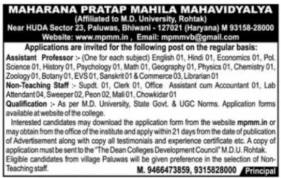 Maharana Pratap Mahila Mahavidyalaya Recruitment 2026 अधिसूचना एवं आवेदन पत्र: महाराणा प्रताप महिला महाविद्यालय भिवानी ने प्रयोगशाला परिचारक, सफाईकर्मी, चपरासी, माली और अन्य पदों के लिए नवीनतम भर्ती अधिसूचना जारी की है। ऑफलाइन आवेदन प्रक्रिया 21 दिसंबर 2025 से शुरू हो गई है। योग्य उम्मीदवार नीचे दिए गए लिंक के माध्यम से ऑफलाइन आवेदन पत्र भरकर इन रिक्तियों के लिए आवेदन कर सकते हैं।